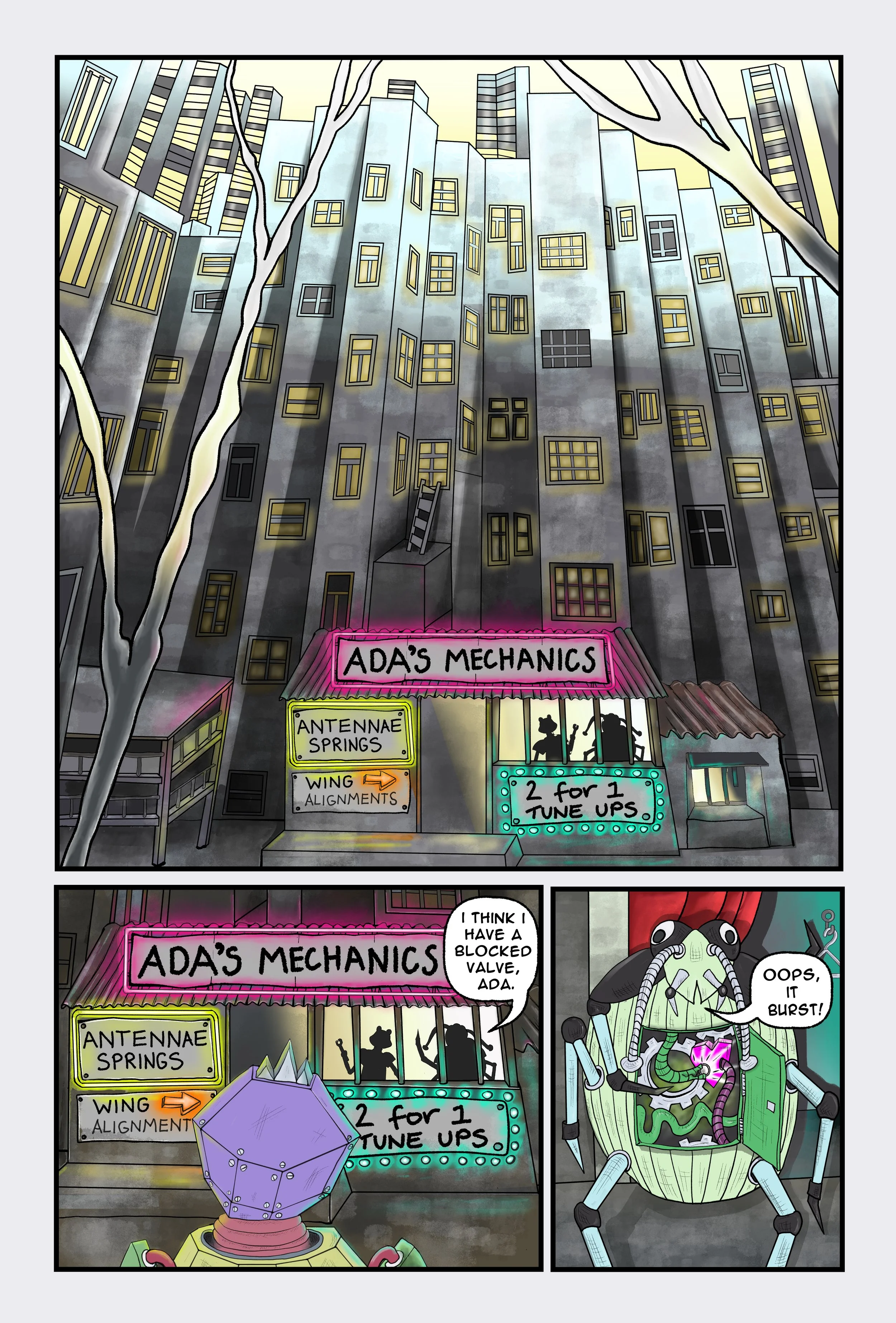 I trained as a traditional illustrator and now use digital tools to create sequential art. As part of developing my middle‑grade science fiction novel Ferals in Space: Mechanica, I produced a graphic novel sample to explore ideas, characters, and worldbuilding. This project reflects my passion for visual storytelling and the way illustration informs my writing.